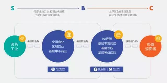 融贯电商通过连接医药生产企业(工业)、医药商业企业以及终端药店、诊所,整合行业优势资源,打造S2B2C商业模式。