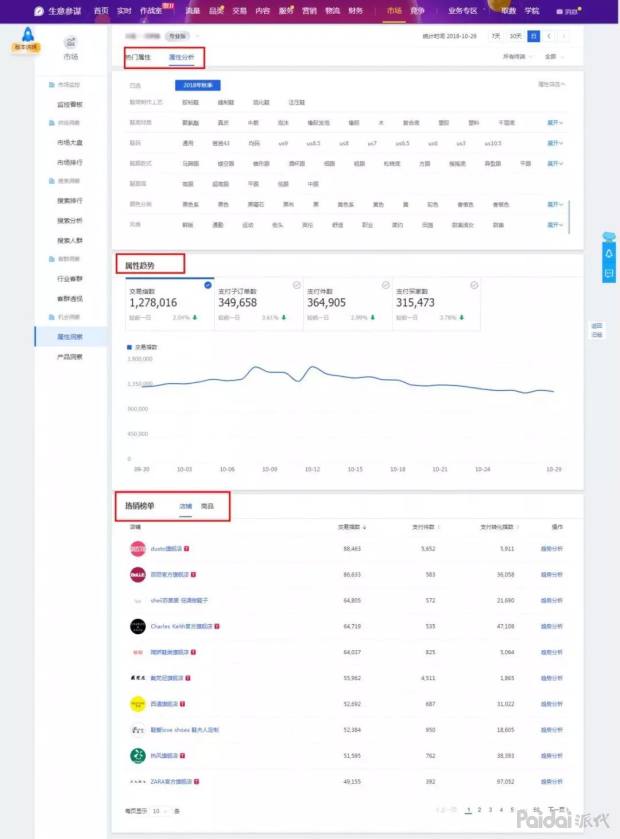 通过这张图,我们可以直观的看到在所选时间内,热销属性的TOP榜单,通过这个榜单,我们可以查看该属性下热销的商品榜,以及店铺榜近期的数据,更有利于我们针对性的做竞品分析,结合商家自身的优势,进行差异化分析。