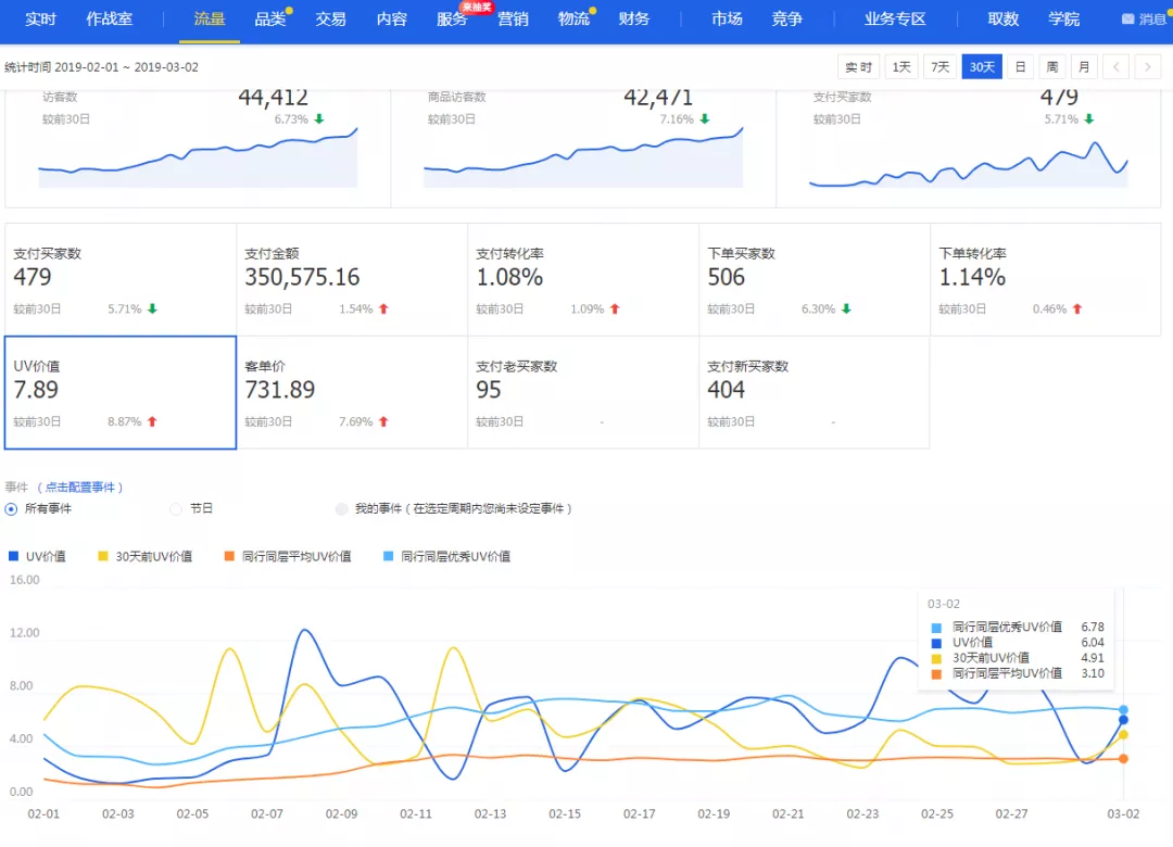 7. 然后再计算自己所在层级的优秀数据和平均数据,这个只能看单品维度,配图是生意参谋后台的截图,在生意参谋-流量-UV价值,可以看到自己的UV价值,以及和你同行同层优秀以及平均的UV价值。