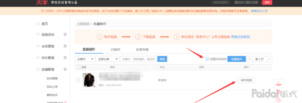 然后点击“仅显示未发布”找出没有主图视频的宝贝,然后点击“制作视频”进入视频制作页面。然后选择自己喜欢的特效点击制作,即可生成一个9秒的主图视频。