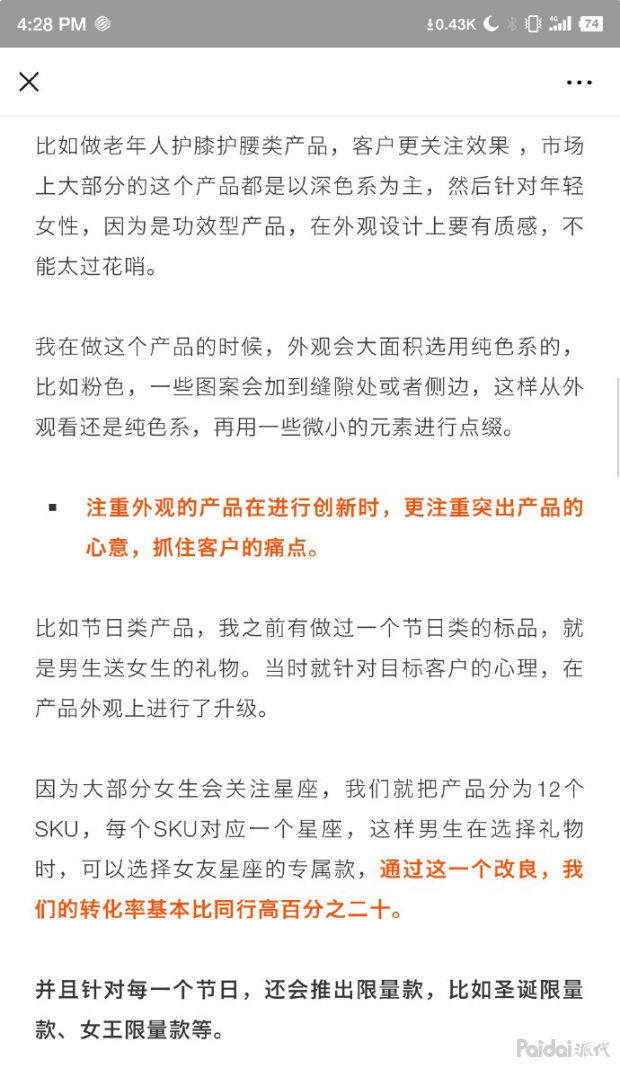 接着他考虑到大部分女生会关注星座,他就将产品分为12个SKU,每个SKU对应一个星座,这样男生在选择礼物时,可以选择女友星座的专属款(他更细分后,转化率基本比同行高出20%)。同时他会针对每一个节日推出限量款,像女王款、圣诞款等。