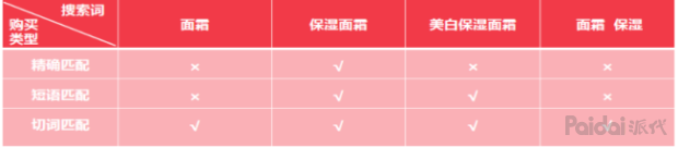 (三)切词匹配:当用户搜索词与关键词相同(或者其省略、颠倒形式),或者搜索完全包含关键词时展示广告。