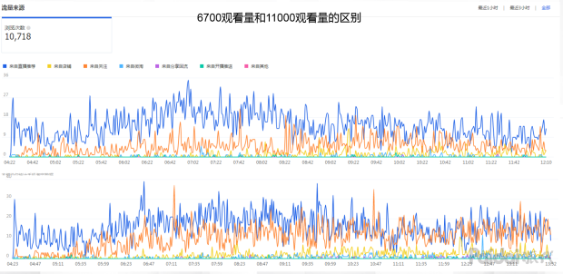 再来看看6700观看量和5100观看量的区别,两图比例尺相同情况下,橙色线(老顾客)波动相似,但蓝色线条(直播推荐流量)新顾客数据相差近1倍。