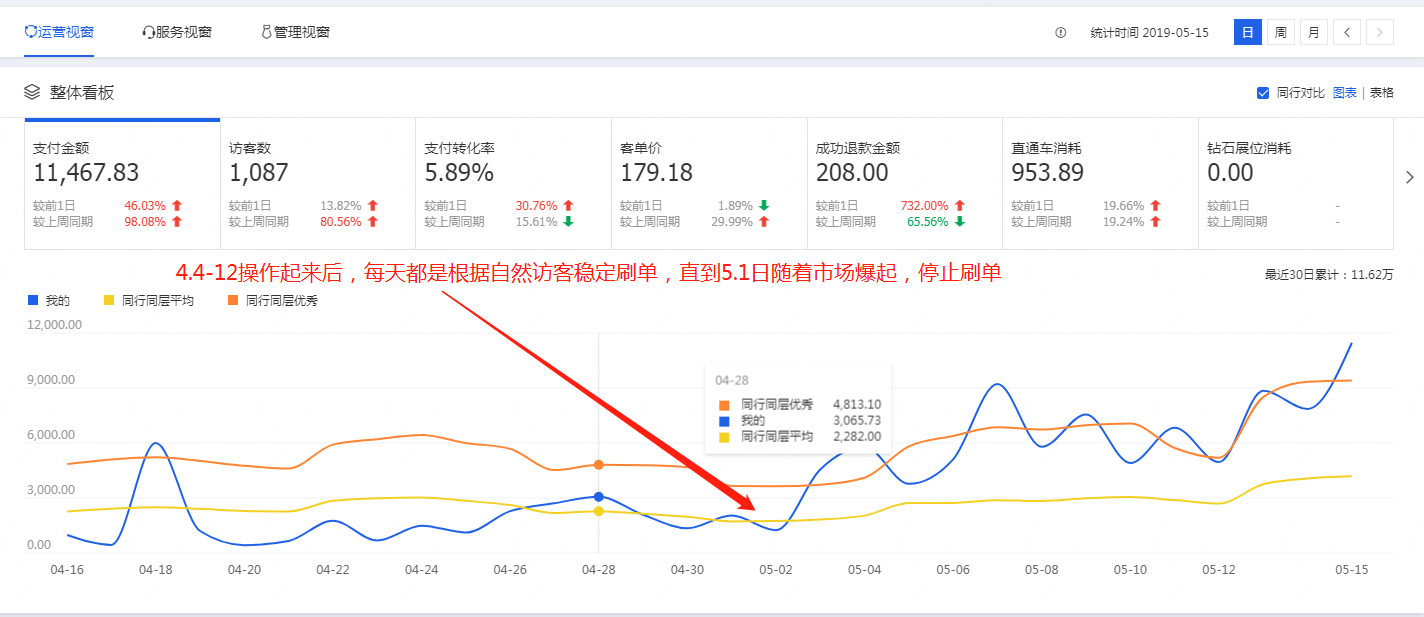 针对淘宝、天猫目前的现状,我们最近测试了很多技术,就目前测试的结果来看,精准标签配合小单量玩法是比较好,单量小,爆发快。方法有没有用,结果最实在,直接上图: