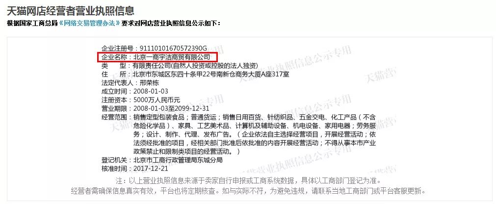 截图中显示为是一家叫北京一商宇洁商贸有限公司来运营的。树苗查询了一下这家公司,发现一商宇洁是广州宝洁有限公司的核心分销商之一。而前面谣言中说是一家卖五金配件的公司?真的不是在搞笑么?