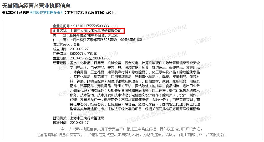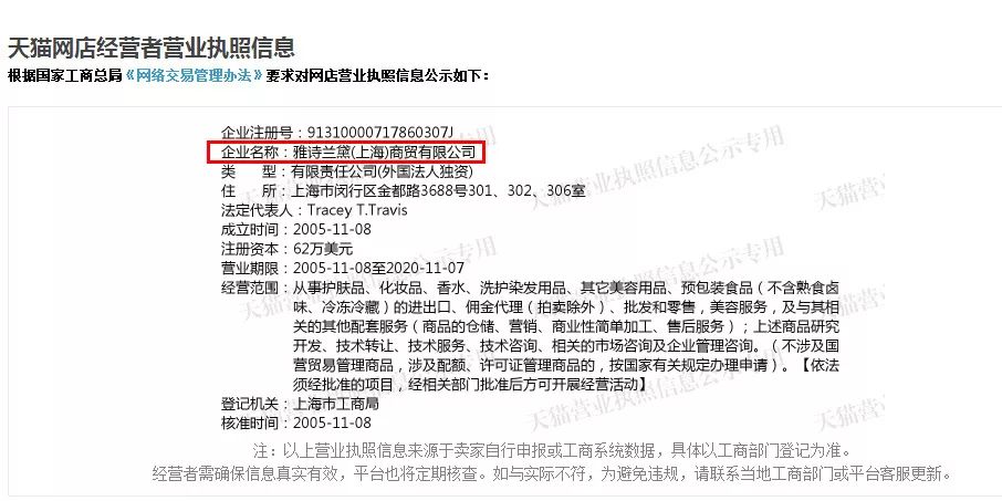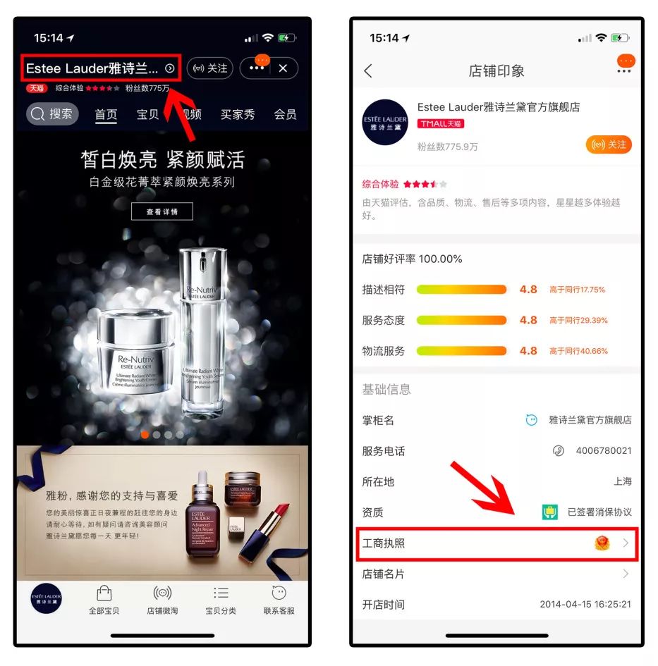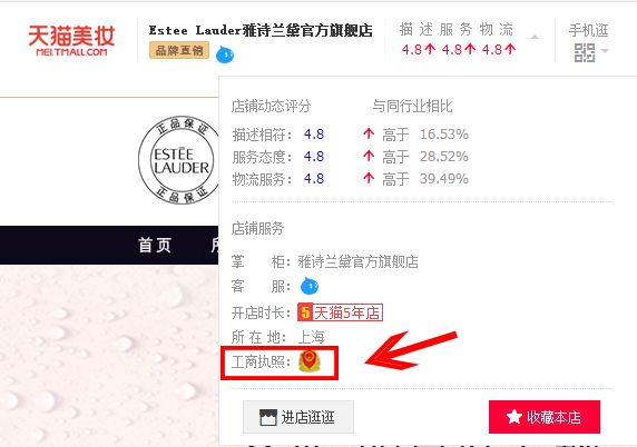 正确输入后就能查看店铺的工商资质证件了,可以很清楚地看到雅诗兰黛的官方旗舰店的确是由品牌方自己运营的!