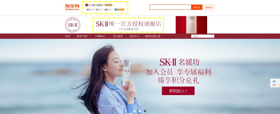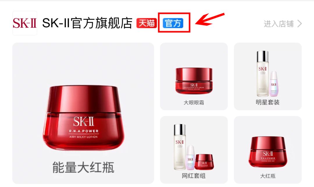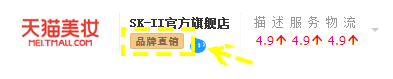 两者之间的区别在于:品牌的官方旗舰店一般都是拥有统一的“品牌直销”标志的,同样还是以SK-II为例,树苗用电脑端打开的页面如下: