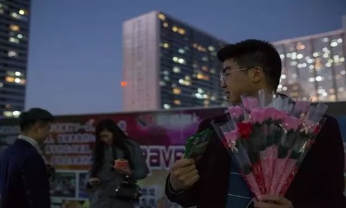 北四村村口,一位创业的年轻人在从地铁站回村的必经之路上,手拿着玫瑰,请过往行人扫码,进行产品地推。