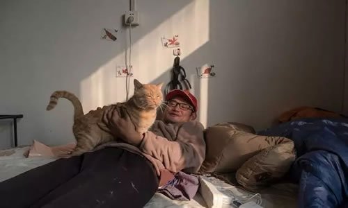 大胜养了一只橘猫,周末,他们一起在家休息。