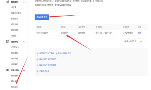 到此就完成了域名跳转的工作,但是为了完美的进行seo的衔接,我们还有做一步操作,就是去搜索引擎中,提交站点改版中的域名改版操作,百度搜索资源平台对改版规则的校验时间范围为0.5——2小时,改版生效时间范围为12——48小时。