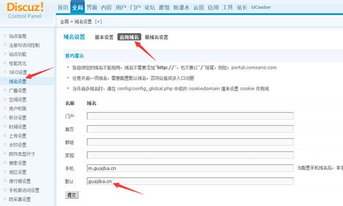 3、这一步并非是必要操作,针对有些站长设置了根域名的操作的,也是我在做域名跳转时纠结了两天的问题,其实很简答,因为有的站长设置了应用域名中的默认域名,所有导致首页的301跳转来回进行,无法准确到指定域名,我们的最后一步操作是:进入论坛后台,点击“全局 》 域名设置 》 应用域名”,填写论坛处需要绑定的域名,点击“提交”按钮。