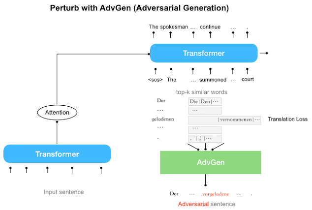 图 1:首先,将 Transformer 模型应用于输入句(左下),并与目标输出句(右上)和目标输入句(右中;从占位符「<sos>」开始)相结合,从而计算翻译损失。AdvGen 函数将源句子、单词选择分布、单词「 candidates 」和翻译损失作为输入,构造一个对抗性源样本。