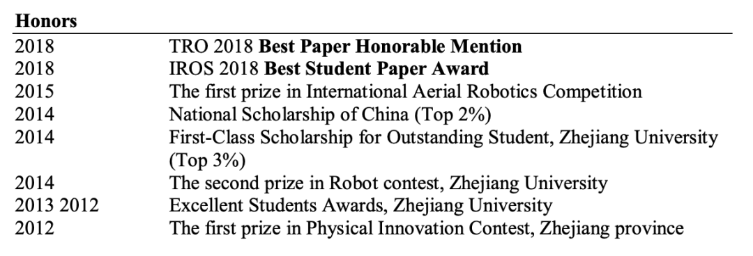秦通还在IEEE TRO、ICRA、IROS、ECCV等国际顶级期刊和会议发表多篇论文,并获得IEEE IROS 2018最佳学生论文奖。