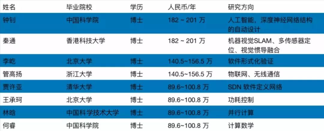 按年薪排序,紧随其后的李屹毕业于北京大学数学科学学院;管高扬毕业于浙江大学计算机科学学院,研究物联网与无线通信等方向;贾许亚毕业于清华大学计算机专业,研究 SDN(软件定义网络)方向。王承珂毕业于北京大学电子与计算机学院,研究功耗控制;林晗毕业于中国科学技术大学,研究并行计算;何睿毕业于中国科学院数学与系统科学研究院。