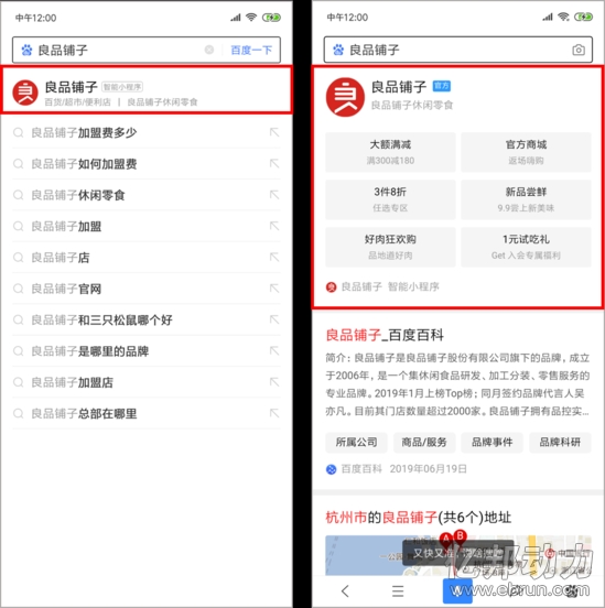 以良品铺子为例,其本身有足够的知名度,每天都有大量百度品牌关键词搜索。通过有赞接入百度智能小程序,消费者无论是主动搜索“良品铺子”,还是从百度信息流的推荐位中,都可以直接跳转到良品铺子小程序下单购买,为品牌带来用户增量和销售增量。