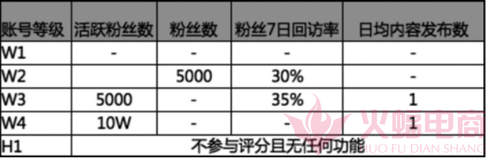 不同分层衡量的指标不同,每个分层(W1、H1除外),都拥有3个状态提醒账号目前所属分层的指标情况。每月1日,系统会依据过去30天数据,根据调整当周的状态进行层级调整:差状态降级、良状态保持层级不变、优状态满足升级条件后晋升下一个层级。每个层级的指标如下: