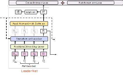 要点序列生成器(Leader)是一个标准的Transformer解码器,以要点序列做为监督信息,根据对话信息解码要点序列。在损失函数中,我们同时考虑了交叉熵损失和自我批判的(self-critical)[1] 的强化学习损失。