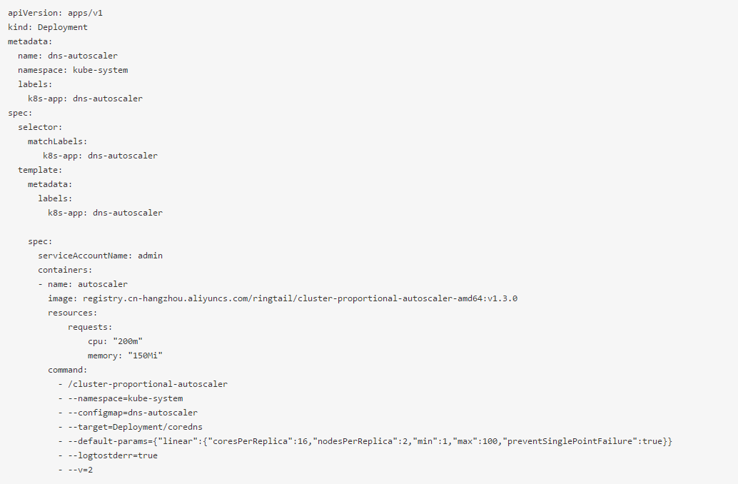 cluster-proportional-autoscaler 和传统的 Kubernetes 组件设计有所不同,我们已经见惯了各种 Controller、CRD 或者 Operator,而 cluster-proportional-autoscaler 走了另外一条非常简单的路。使用 cluster-proportional-autoscaler 只需要部署一个 Yaml 并选择一个伸缩的监听对象以及伸缩策略即可。如果需要有多个组件进行伸缩,那就部署多个 Yaml,每个 Yaml 包含一个 cluster-proportional-autoscaler。一个使用 cluster-proportional-autoscaler 弹性伸缩 coredns 的模板如下。