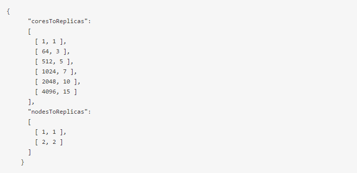 这个配置表示存在 coresToReplicas 和 nodesToReplicas 两个梯度,其中 coresToReplicas 的梯度表示:最小为 1 个副本;CPU 核心数目大于 3 小于 64 的时候,为 2 个副本;依次类推。