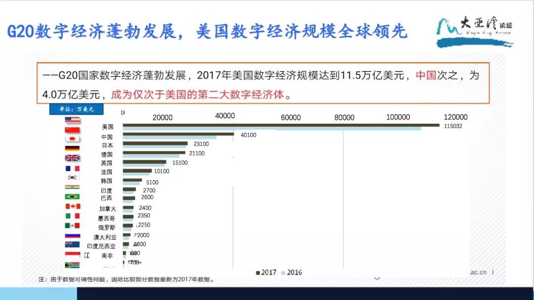 现在数字经济时代已经不像过去,传统的车间今天生产,明天才能结算出报表,才知道从业状况怎么样。现在是当天就要知道经营状况,工业互联网就是让我们第一时间了解生产制造现状。它会帮你把控相关的设备参数,制造出特定的产品,并倒推找到制造过程的关键参数。我们通过锁定这些参数,设备的参数不对时就不再生产,这就是不制造不良品。不制造不良品,使得不良率、成本减少,利润增加,这叫数字经济。看整个数字经济带来的GDP的数据,比如美国。2017年美国带来的是11.5万亿美元的GDP,而中国是4万亿。这就是为什么国家多次强调要助推加推数字经济的发展,加工传统产业的升级。