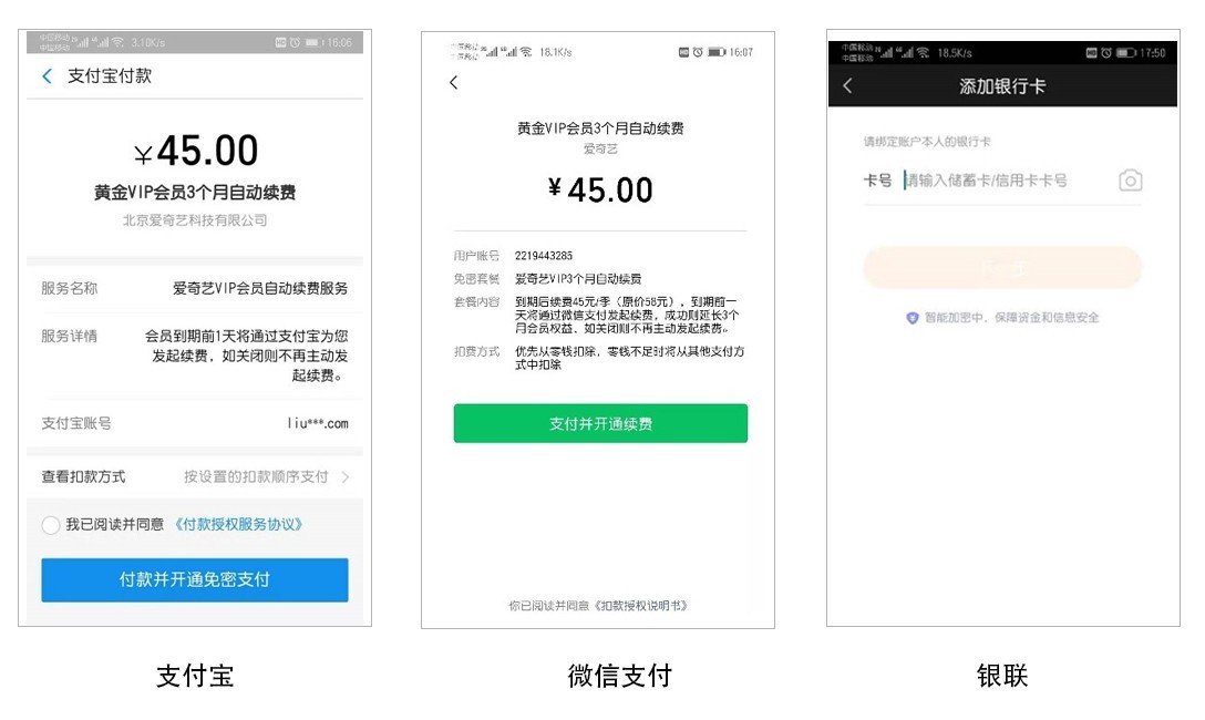 收到这个消息后,倒是提醒我了,上文中提到的爱奇艺通过银联也能连续按周期扣费。我只顾查看微信支付和支付宝的资料了,而把银联这个官方给忽视了。