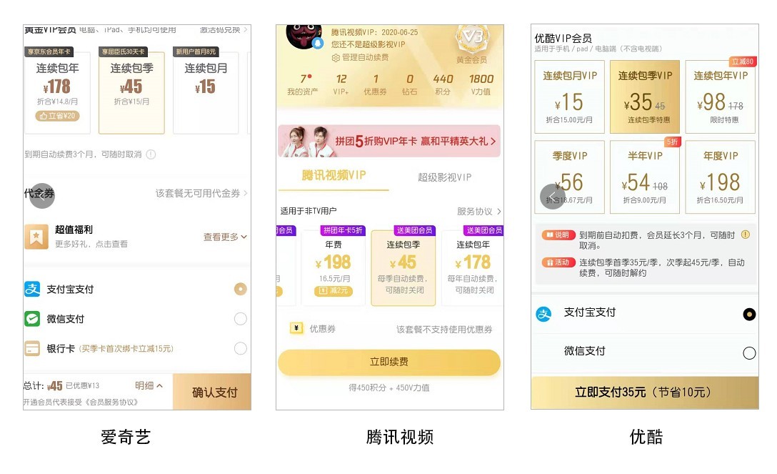 这里我们首先来看下视频是通过那些支付工具来付款。如上图爱奇艺用的是微信、支付宝和银行卡,腾讯视频只用微信(它肯定不用支付宝),优酷用的是微信和支付宝。
