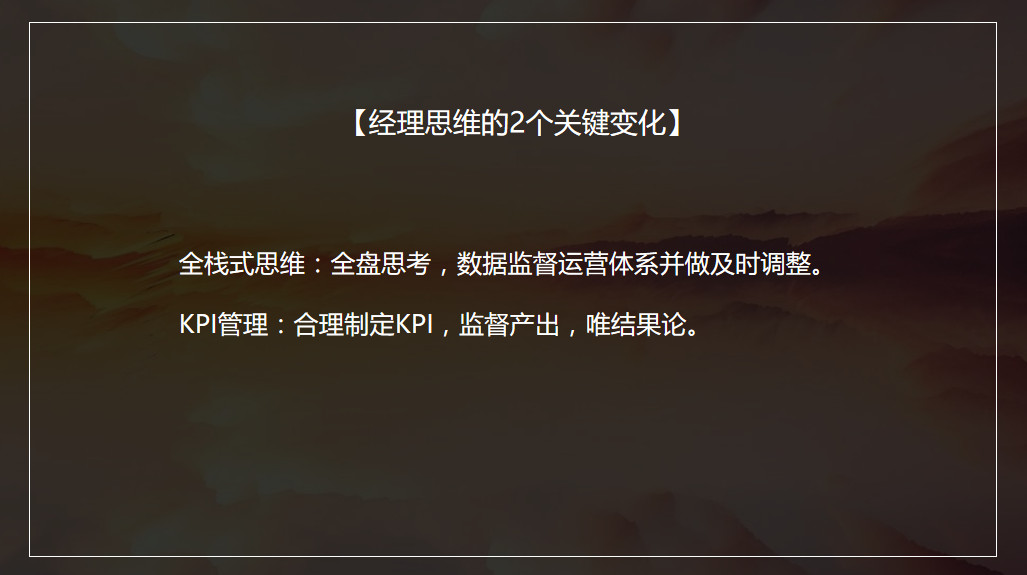 3. 经理阶段,思维又要开始往全盘布局和团队管理转变。其中有2个关思维:全栈式运营和KPI管理。
