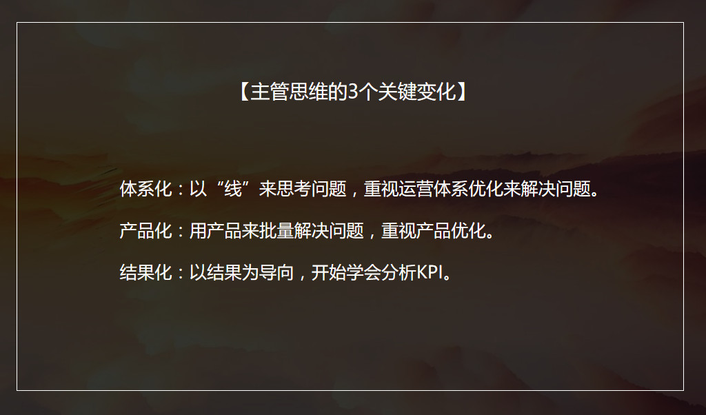 2. 主管阶段,思维要从执行者,逐步的转变为思考者和结果承担者。其中也提炼3个关思维:体系化、结果化、产品化。