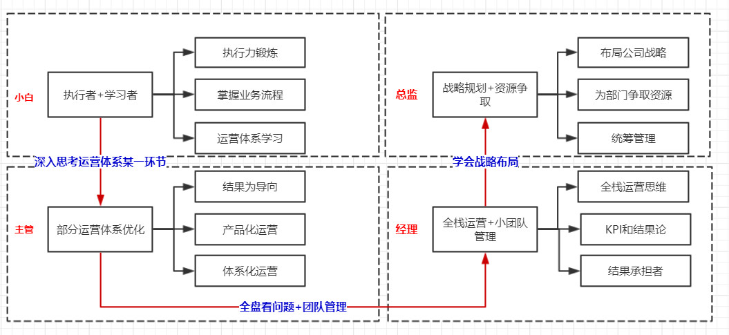 这个阶段,基本不参与执行工作,经历侧重于运营体系的完善。我们要开始根据公司规划,来重新梳理整个运营体系,布局核心运营点,调整运营人员架构,跟踪数据并不断地调整运营体系,以达成最优效果。由此,你开始以全栈式眼光看待运营,开始成为导演,开始控制整个运营体系。