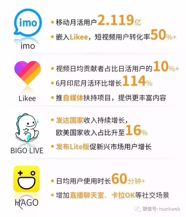其中,Likee平均移动月活跃访问用户达到8070万人,同比增长了374.7%;imo的嵌入式短视频服务的平均移动月活跃访问用户达到960万人。