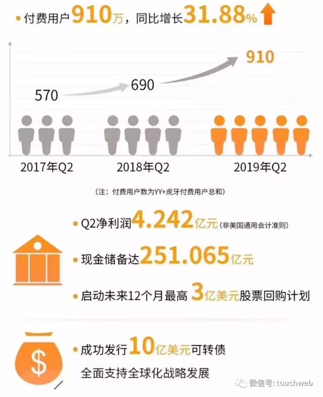YY第二季度付费用户总数达420万人,较上年同期的350万人增19.1%。虎牙第二季度付费用户达490万人,较上年同期的340万人增46.7%。