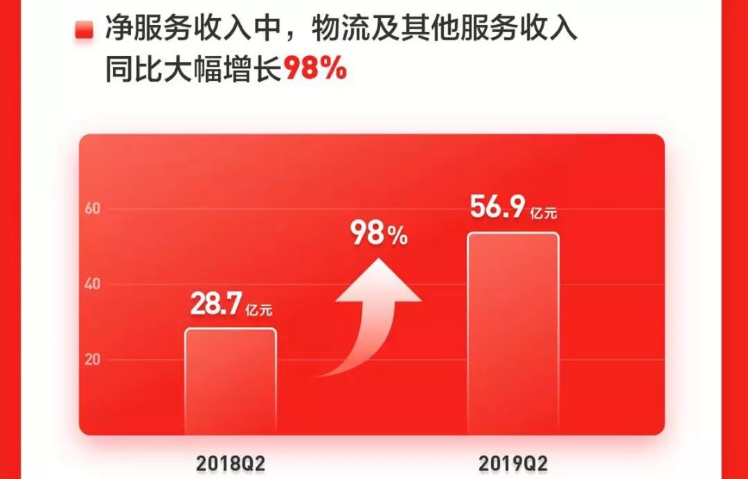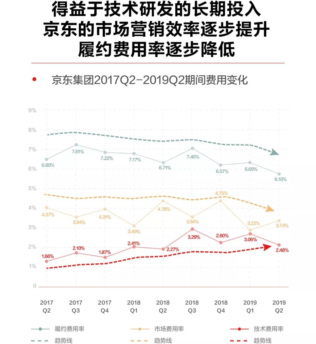 净服务收入包含佣金、广告、物流及技术服务等收入。其中,得益于开放战略及技术创新,本季度京东履约费用率下降至6.1%,创下近三年来的新低,物流及第三方服务收入同比增速达98%。