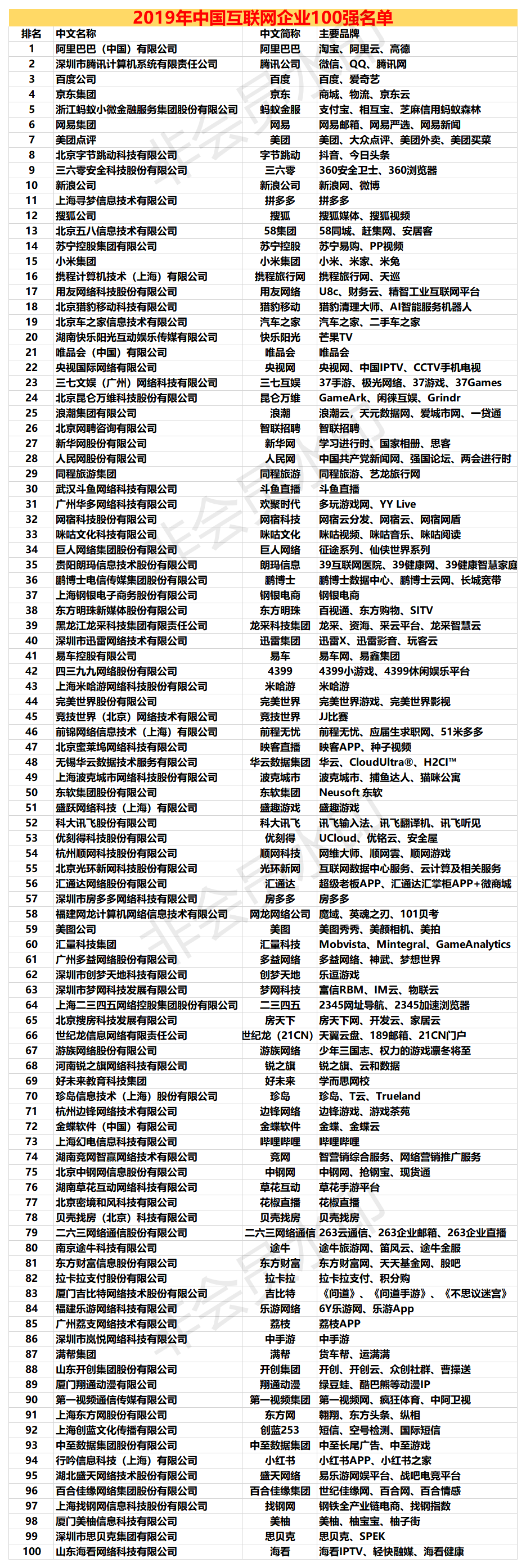 附:2019年中国互联网企业100强名单