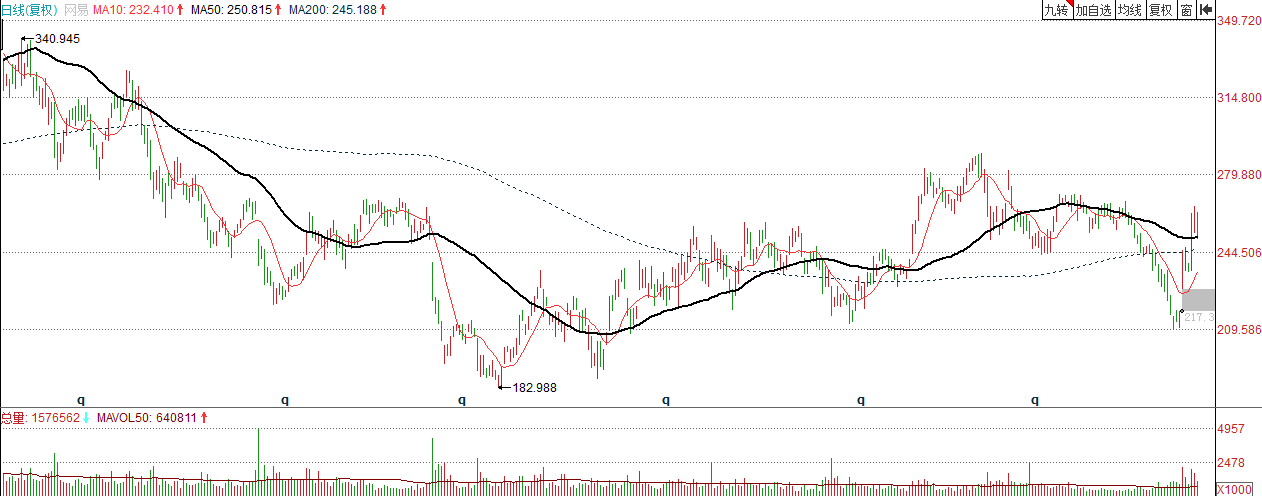 通过上面两个截图,可以非常直观的看到,百度股价正处于一个长期的下降趋势中,而网易股价在经过去年的下跌之后,今年股价已经逐步开始向上反弹。
