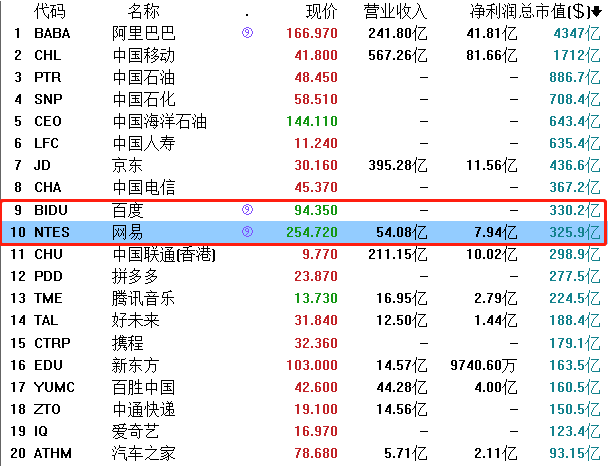 百度市值小于网易市值