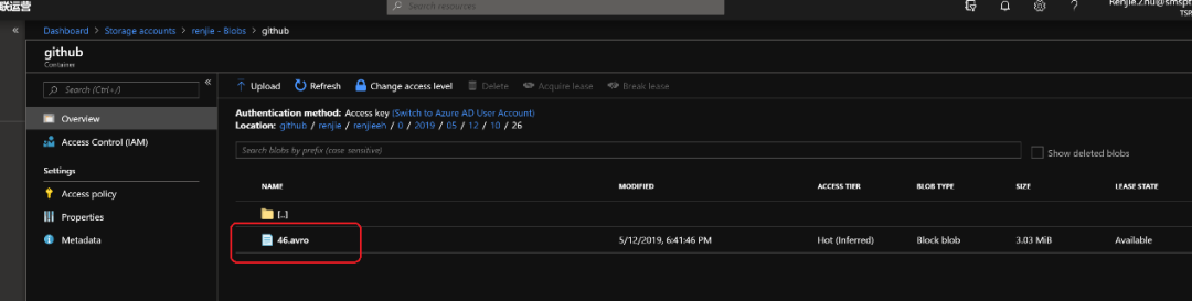 再到我们刚在建立的blob容器中也去检查一下,是不是Azure Event Hubs把所有的数据发送了过去。这里你会发现Azure Event Hubs capture的数据格式是比较流行的avro文件,之后我们就可以用spark来分析他们啦。