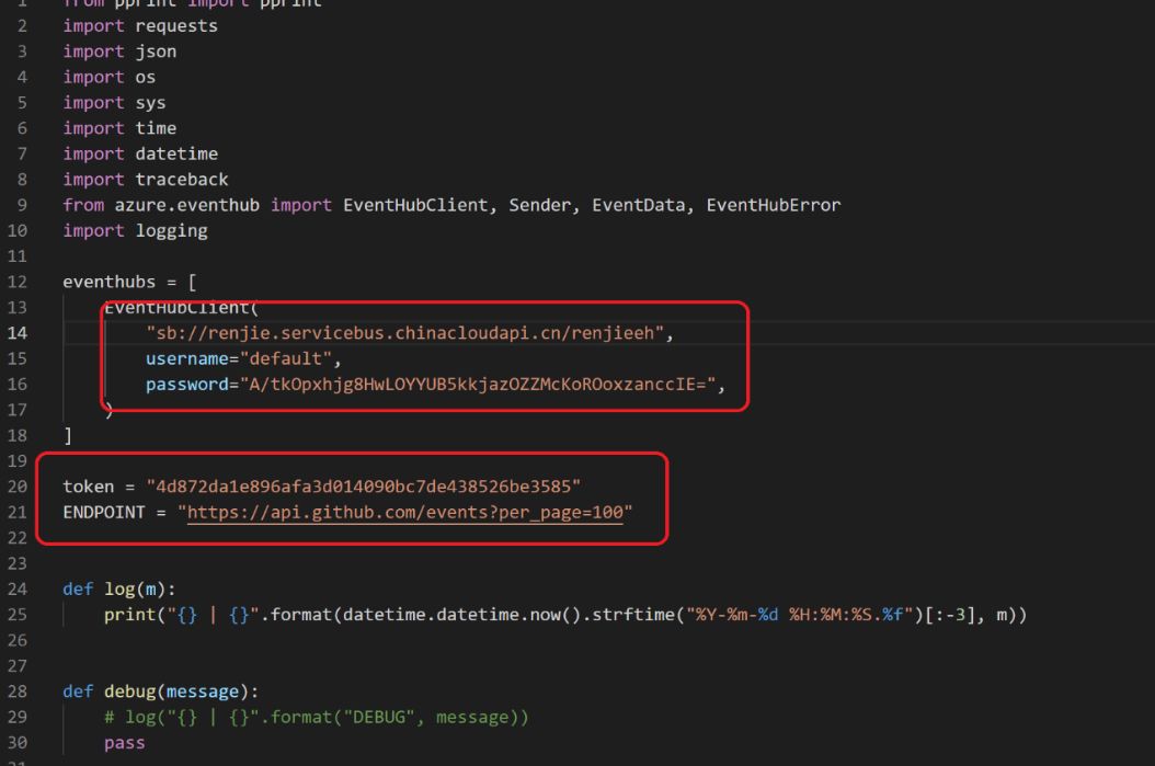 接下来我们打开爬虫的文件,填入需要修改的连接串,以及密钥。其中有两个地方需要修改。一个是你的GitHub的token,用来调用api抓取数据,如果不用这个的话,你的ip可能很快就被封锁。另外一个地方就是Azure Event Hubs的链接地址,以及相对应的token。