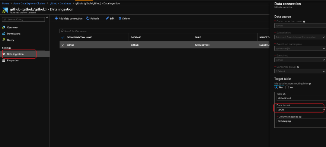 接着,在ADX中建立一个数据库,以及表格,使表格和GitHub上传递来的数据匹配。