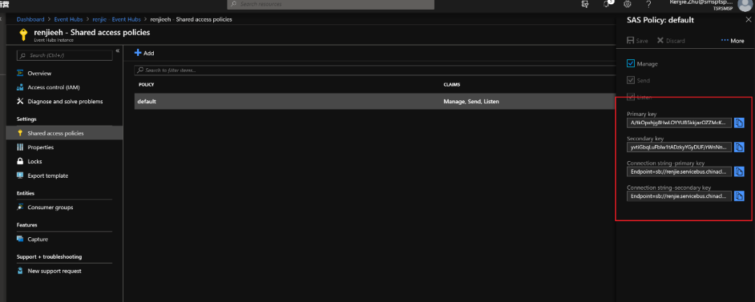 等待实体建立好之后,需要到访问控制里面去新建一个访问策略。并记下连接串,以及密钥。随后是需要在爬虫程序里面填入相关的信息的。