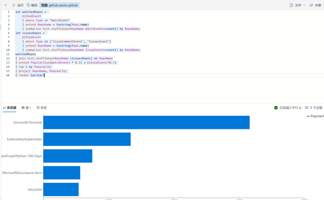 现在,我们需要快速的用KQL语句来对最流行的项目做一个查询。发现最近不论watch,还是issue,微软的build大会上发布的全能Terminal最近风靡GitHub,当然还有已经毕业的开源项目K8s,同时发现微软的文档的关注量也不断上升。不过需要注意的是,GitHub 项目排名实时更新,本文结果不能代表最新数据哦,欢迎大家动手实践。