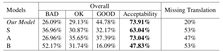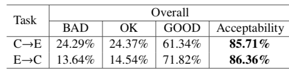 为了评估当前机器同传技术的进展,百度翻译团队邀请了3个具有不同工作年限(3-7年)的同传译员,模拟真实的同传场景,对BSTC中的同一个演讲进行同声传译。最终结果表明,无论是采用传统的BLEU自动评价指标,以及人工译员的人工评价方法,度同传都表现出极具竞争力的翻译水平。