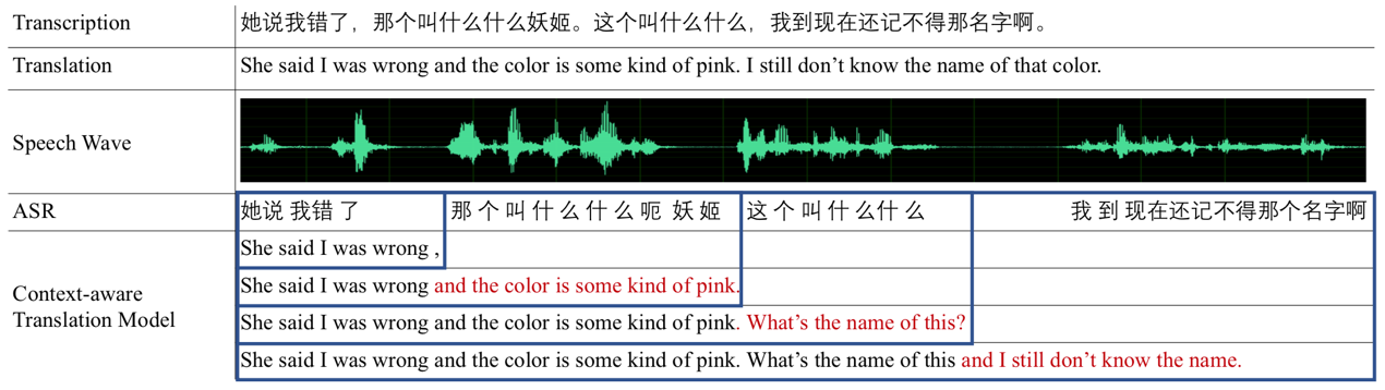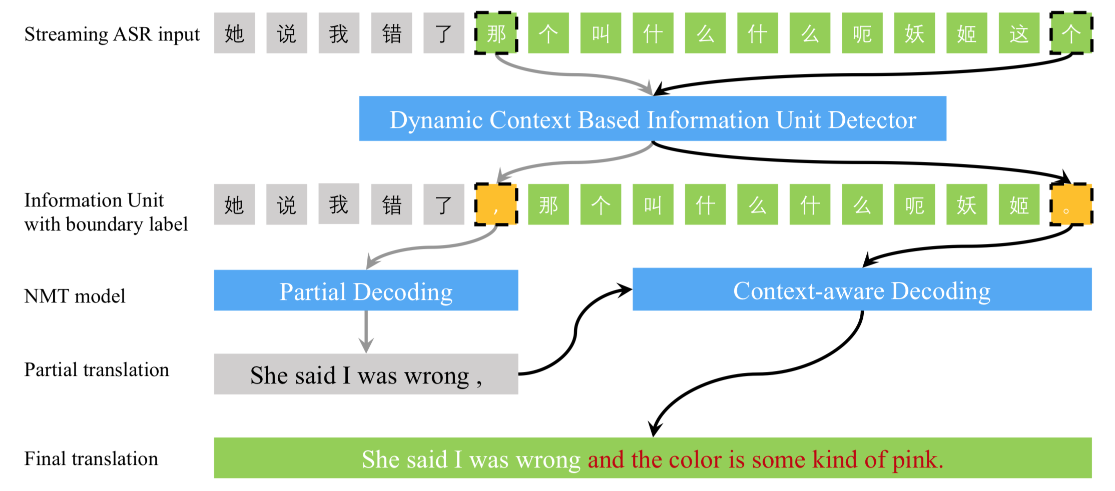 以下面的句子为例,如果等到句子结束再进行翻译,时间延迟会非常大。对于实时的语音流,IU检测模块会判断语音片段是否表达了一个完整的意思,比如“她说我错了”被识别为一个IU,此时进行翻译,既完整的传达了原文意思,又可以同步地跟上演讲者的节奏。