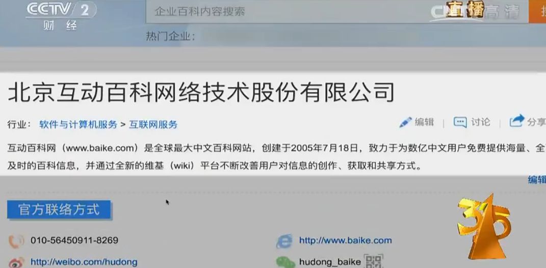 那年315,央视曝光了互动百科的那些见不得光的交易。央视报道称,互动百科在词条编辑上,向用户收取了费用,造成了大量虚假信息的存在。