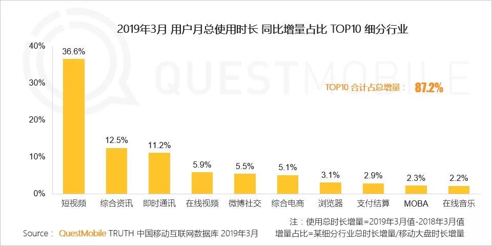根据QuestMobile发布的《中国移动互联网2019春季大报告》显示,截至2019年3月,我国移动互联网用户每天花在移动互联网的时间为349.6分钟,同比增长36.8分钟,而2019年3月,用户月总使用时长里有36.6%花在了短视频上。另外,QuestMobile的短视频2019半年报告也表示,短视频月人均时长超过22小时,同比上涨8.6%,相反在线视频、手机游戏、在线音乐均在下降。