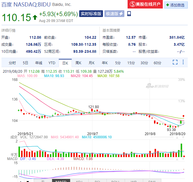 今日早间,百度公布了2019年第二季度未经审计的财务报告:财报期内,百度实现营收263亿元人民币,净利润24亿元人民币。财报发布后百度股价大涨,截至北京时间20:25分,百度股价为114.4美元,盘前涨幅超过10%。开盘后,百度最新股价为110元,较昨日上涨7%,截至目前,共有22家机构分析师给出买入评级。