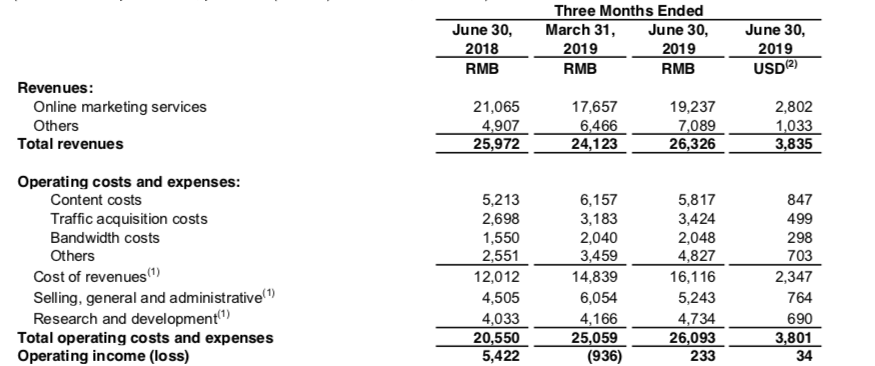 2019年Q2,百度共完成263亿元的营业收入,同比增长(排除度小满和百度国际剥离后影响)6%,环比增长9%,在经过Q1营业亏损4%的危机之后,Q2营业盈利为1%,情况略有好转。