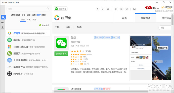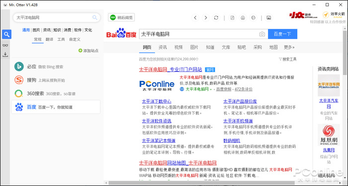 [PConline应用]正所谓术业有专攻,有经验的用户一般都会用不同的搜索引擎来搜索查找不同的资源内容,以便更快更好的找到自己需要的东西。现在有了一款综合的搜索工具,可以帮你大大的加快搜索效率,免除了多个搜索引擎来回切换的麻烦,这个搜索工具名叫Mr. Otter,它有啥特色功能呢?请跟着小编来体验一下吧。