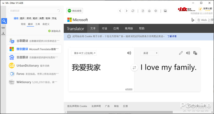 而在通用搜索引擎分类下,又有着细小的分类,Mr. Otter还将其分类为了常规、翻译、工具。其中翻译分类就是快速调用多个搜索引擎的翻译功能来翻译关键字,工具分类则又查快递、查指数、查地图等功能。