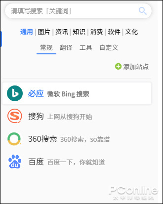 可以看到,Mr. Otter为用户准备了不少的搜索引擎以及内容引擎,并将它们进行了分类。比如在通用搜索引擎中就包含了大家常用的百度、必应、搜狗等搜索引擎,用户还可以自行添加其它搜索引擎。