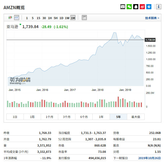 亚马逊股价近五年走势,来源:英为财情Investing.com